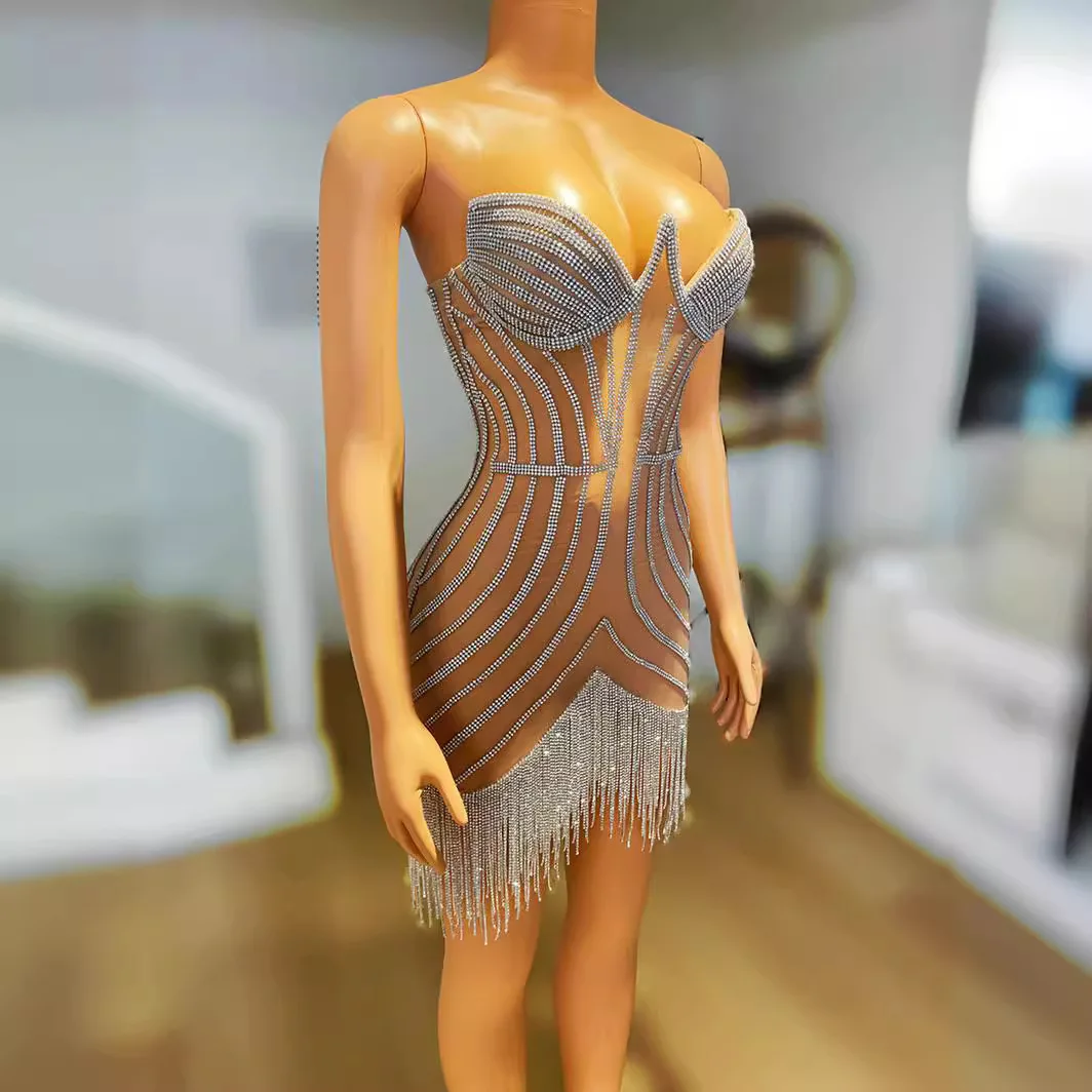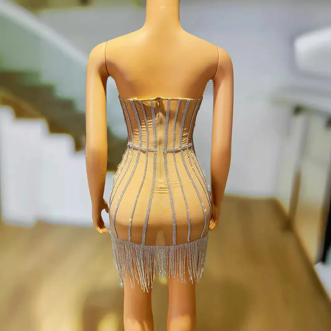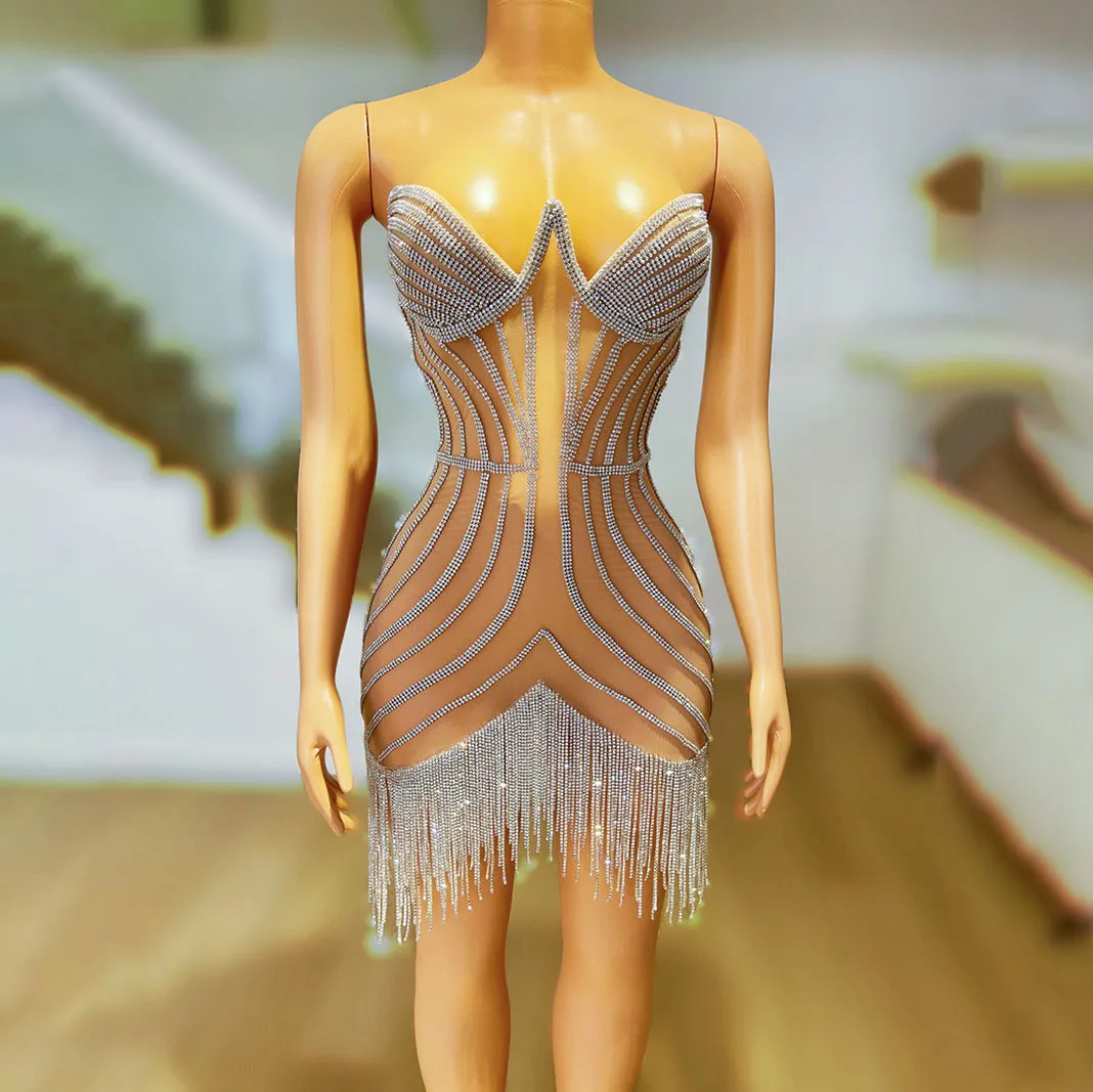 Luxury Sparkling Diamond Tassel Club Night Dress Women's Rhinestone Body Chain Party Wear Dance Floor Sexy Short Evening Gown